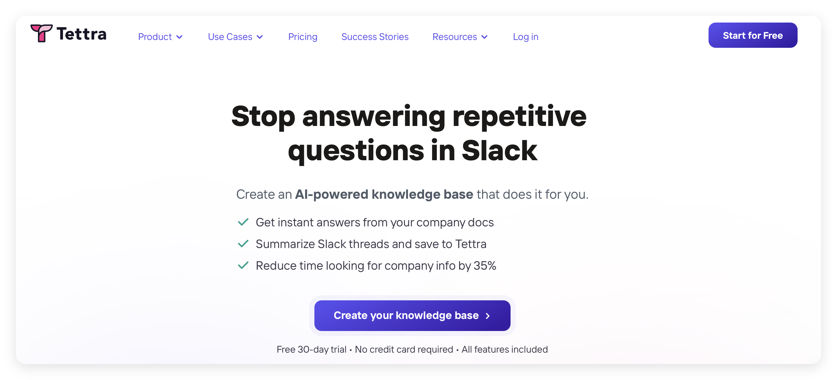 Tettra是一款AI工具,允许您“通过Tettra的简单编辑器创建新的内部文档,或利用现有内容(如Google Docs、Notion、本地文件等)快速构建您的知识库。”