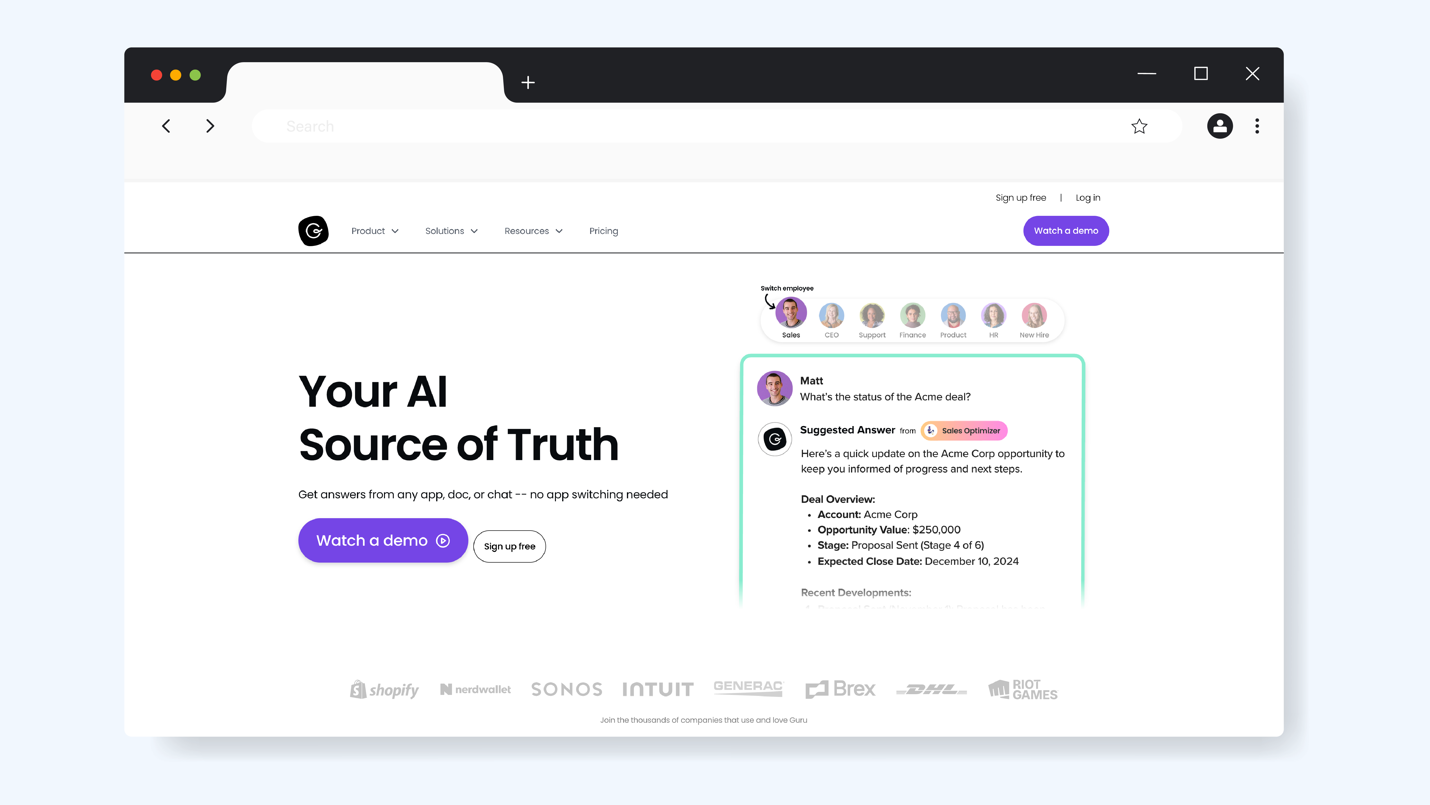 Guru 是知识管理领域的佼佼者,凭借其 AI 知识捕捉技术和与 Slack 的无缝集成能力,赢得广泛认可。支持将信息嵌入工作流程中,让团队获取实时、可信的答案。