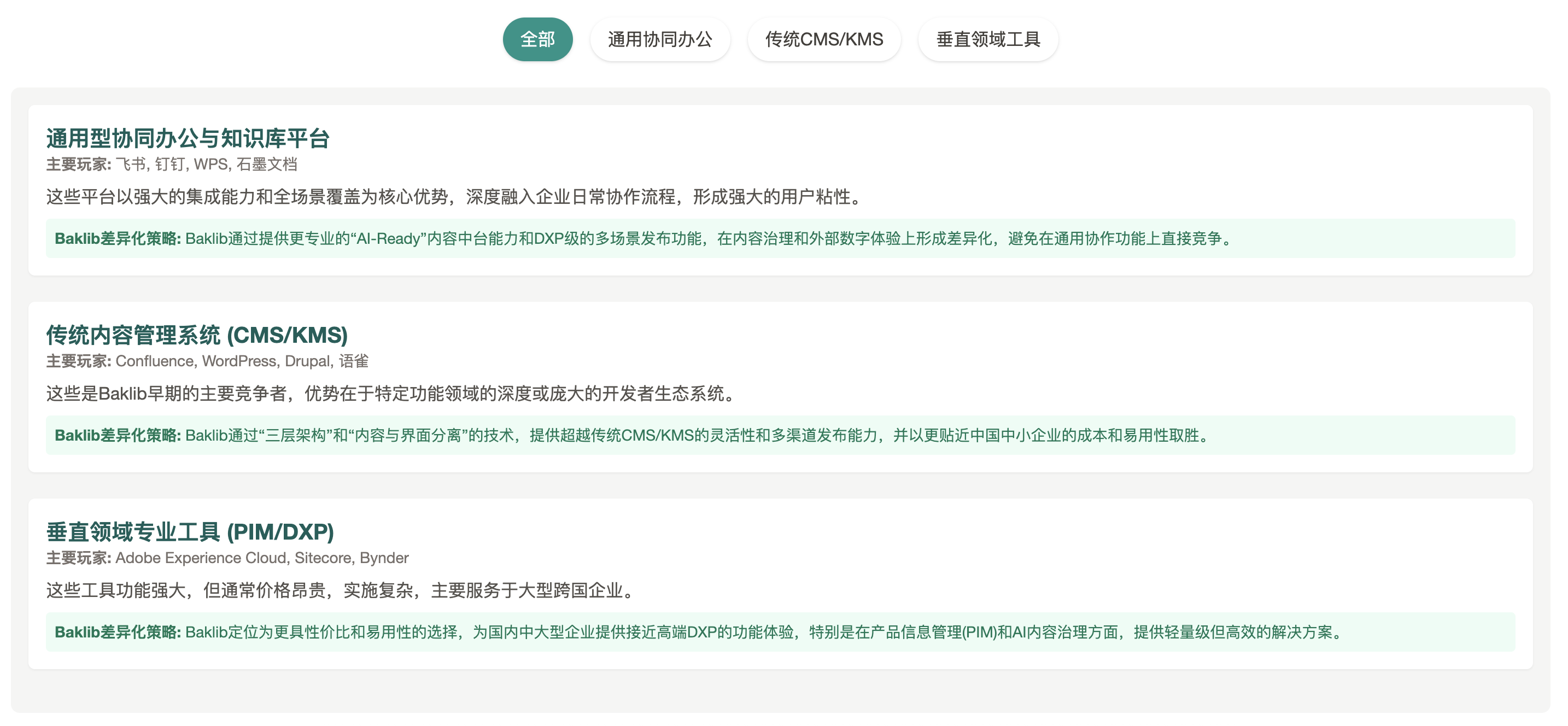 Bynder/Oracle PIM | 产品信息管理(PIM) | 产品数据集中管理、分发 | 制造业、零售业、电商 | 独立部署/订阅 | 有限,集中于数据处理 | 间接竞争,特定垂直领域,但Baklib的PIM能力可以切入 |