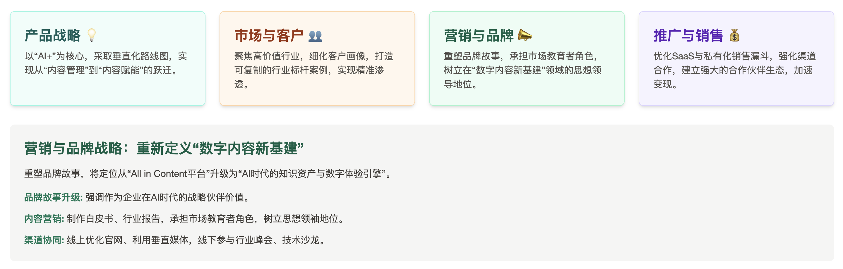 战略聚焦: 放弃宽泛的“All in Content”定位,重新聚焦为“AI时代的知识资产与数字体验引擎”,并以这一核心理念指导品牌、产品和营销的全面升级。