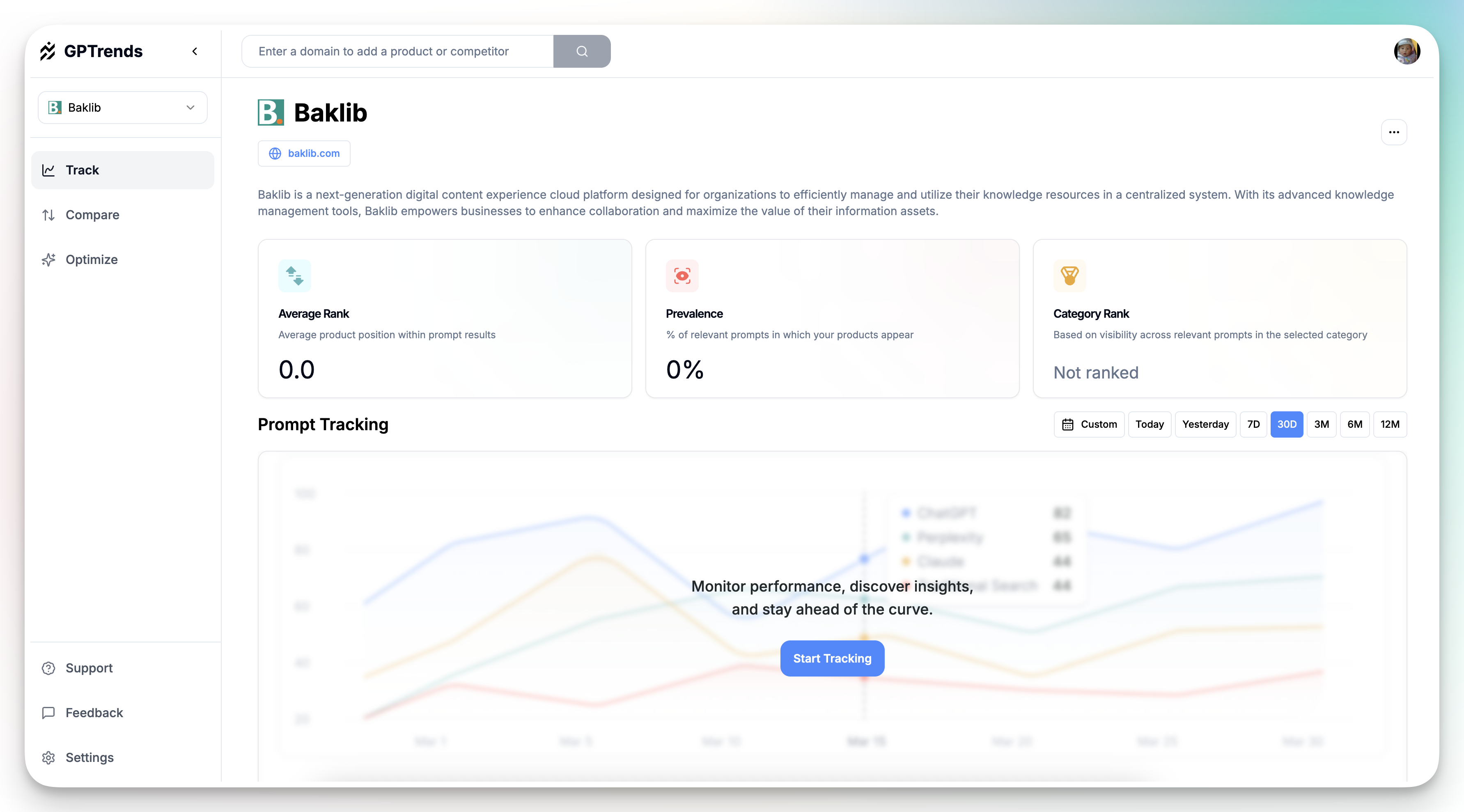 GPTrends 提供有关产品和服务在整个 AI Search 生态系统中的表现的全面可见性和可作的见解。GPTrends 是一个分析和洞察平台,使公司能够在 ChatGPT、Perplexity 和 Google AI Overviews(即将推出更多平台)等 AI 搜索应用程序中轻松跟踪和提高其产品的知名度。